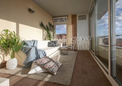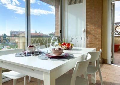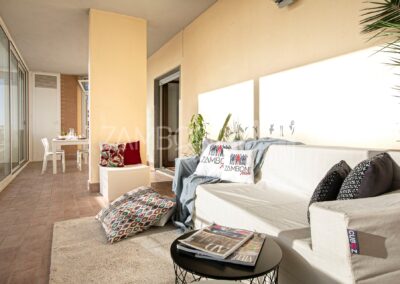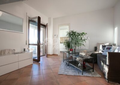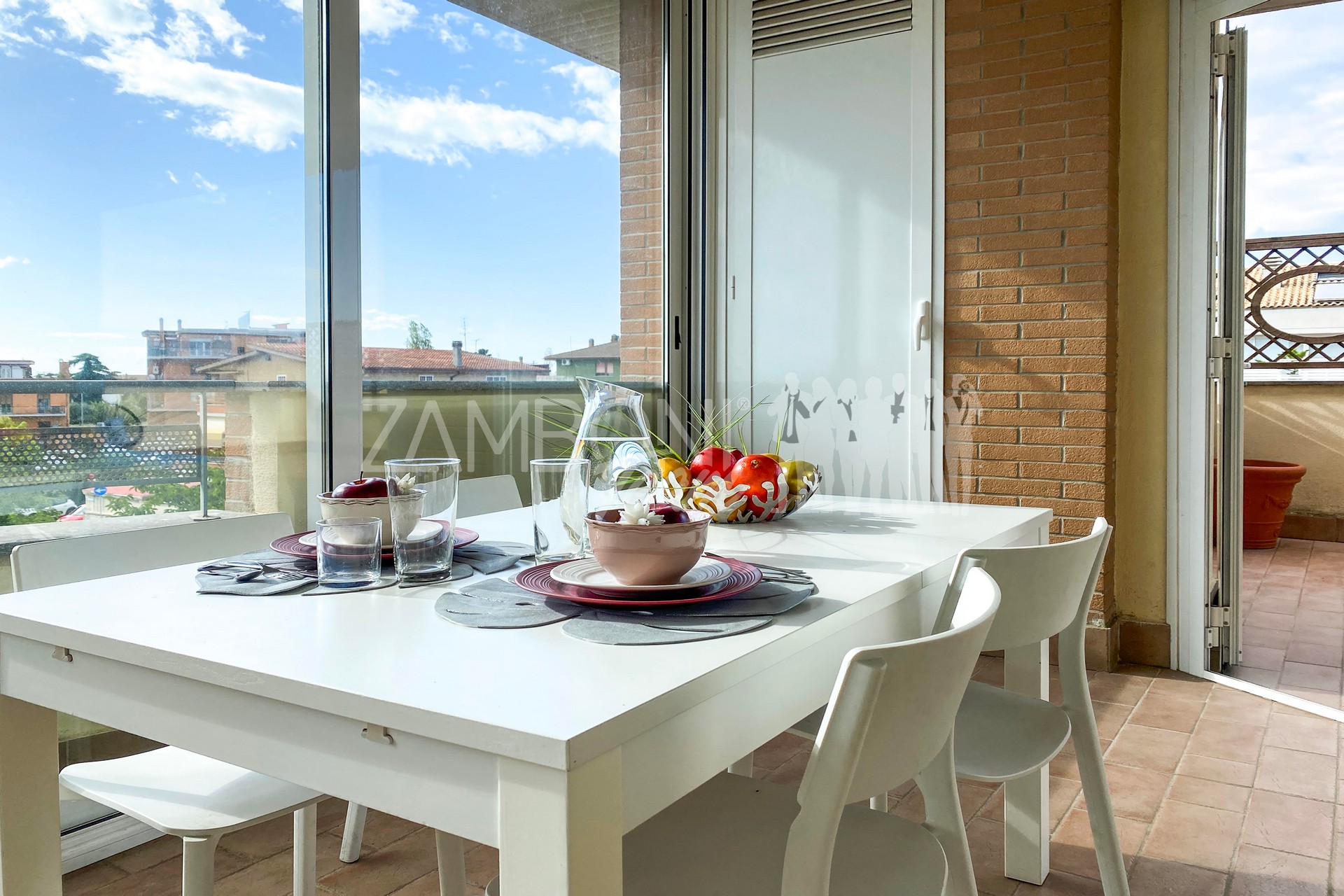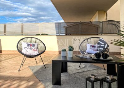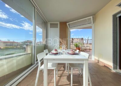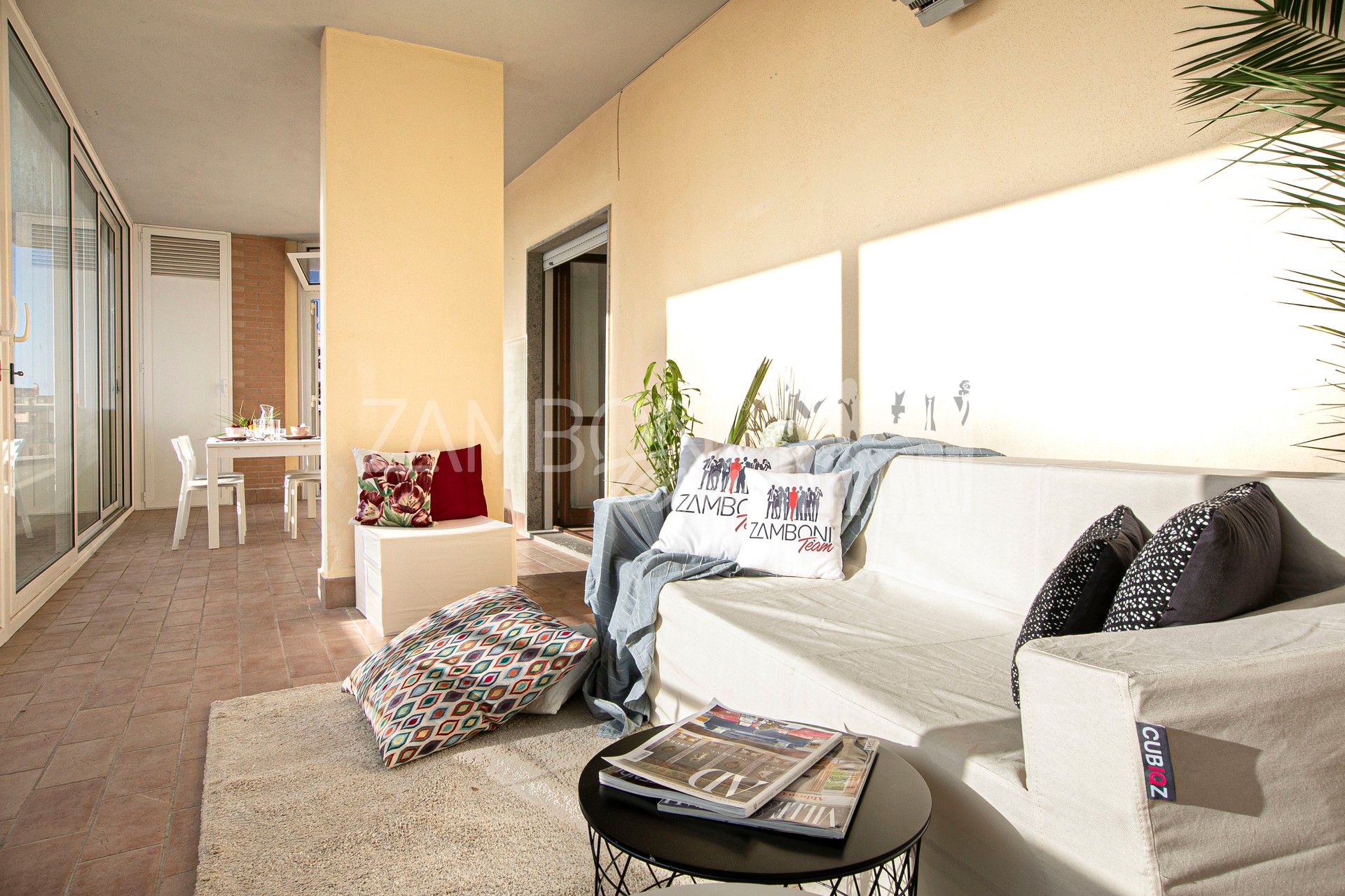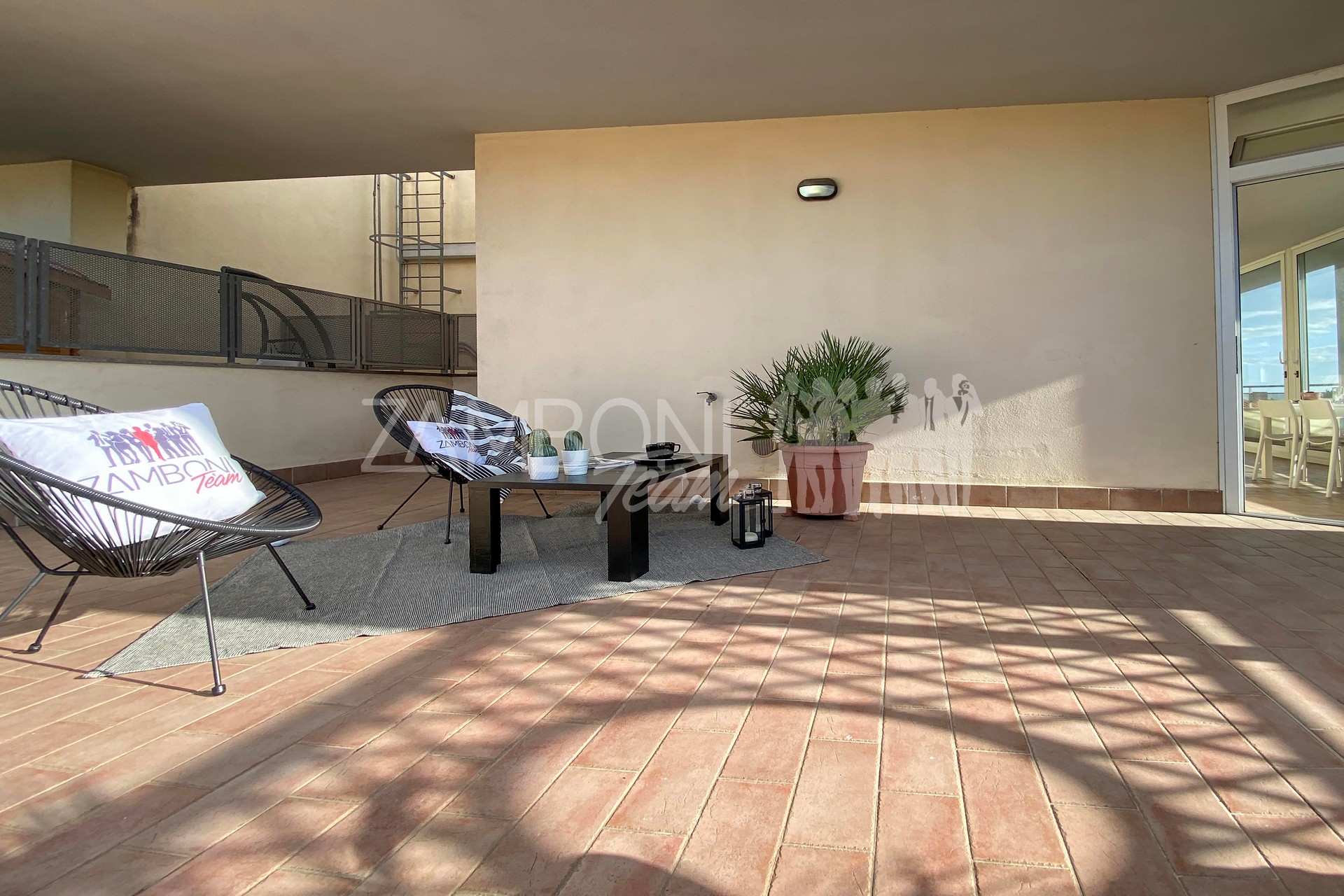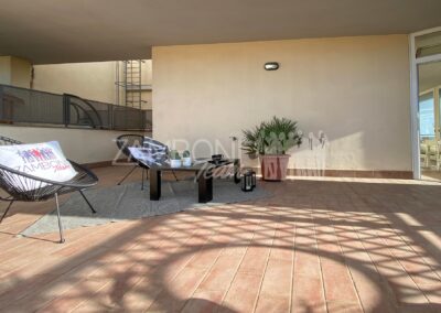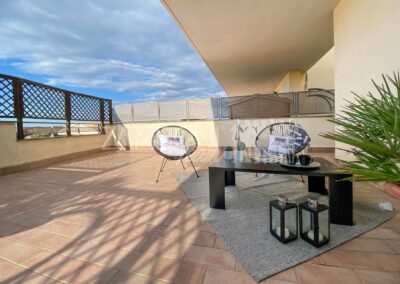Il terrazzo principale è chiuso con delle porte finestre che ne consentono l’utilizzo anche nella stagione più fredda permettendo di fatto di guadagnare un’ ulteriore ampia zona soggiorno. I due terrazzi a pianta quadrata sono invece posti con affaccio est ed ovest.