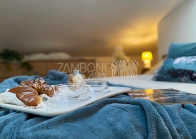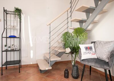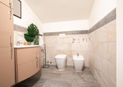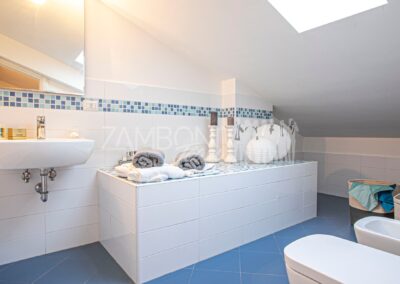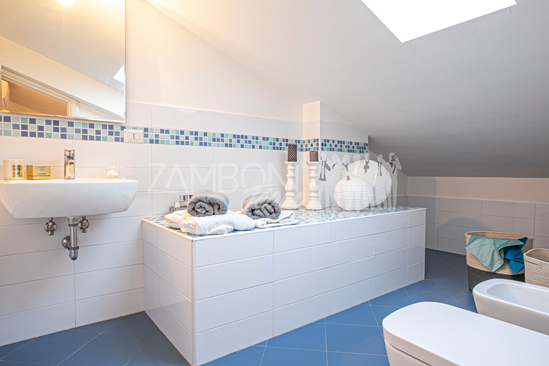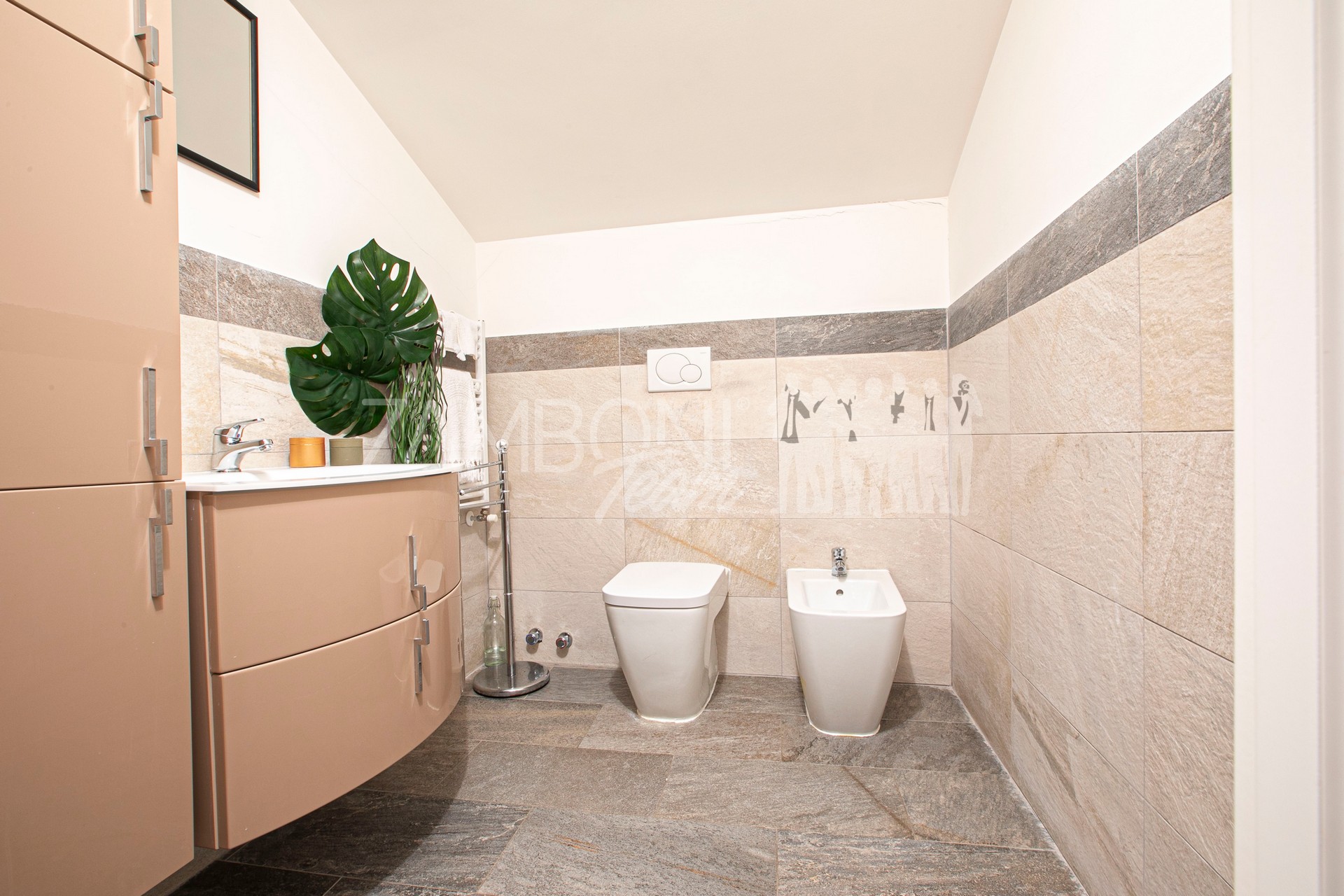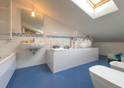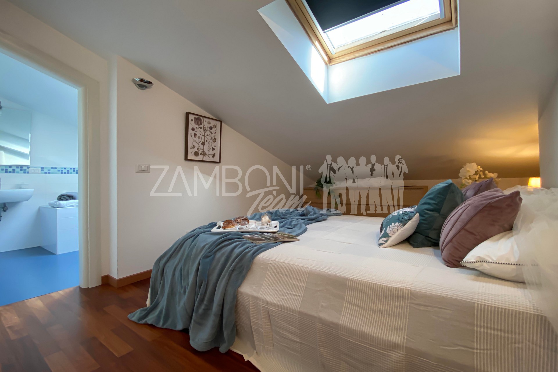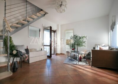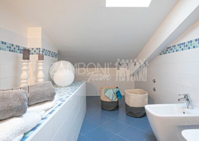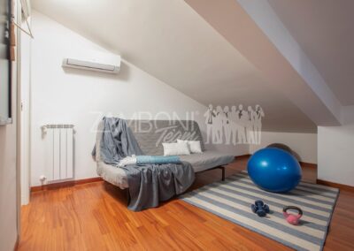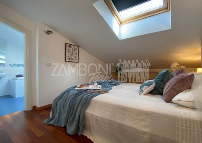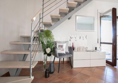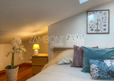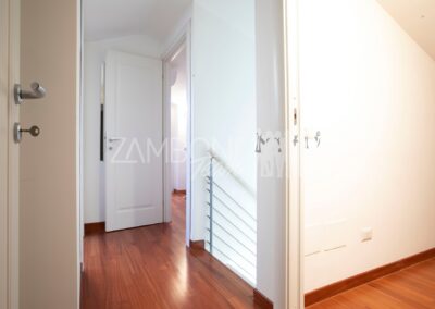 Il piano superiore dell’attico mansardato ma abitabile è raggiungibile tramite una scala di design ed ospita le due camere da letto e un ampio bagno come da disegno della società costruttrice.