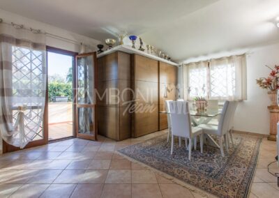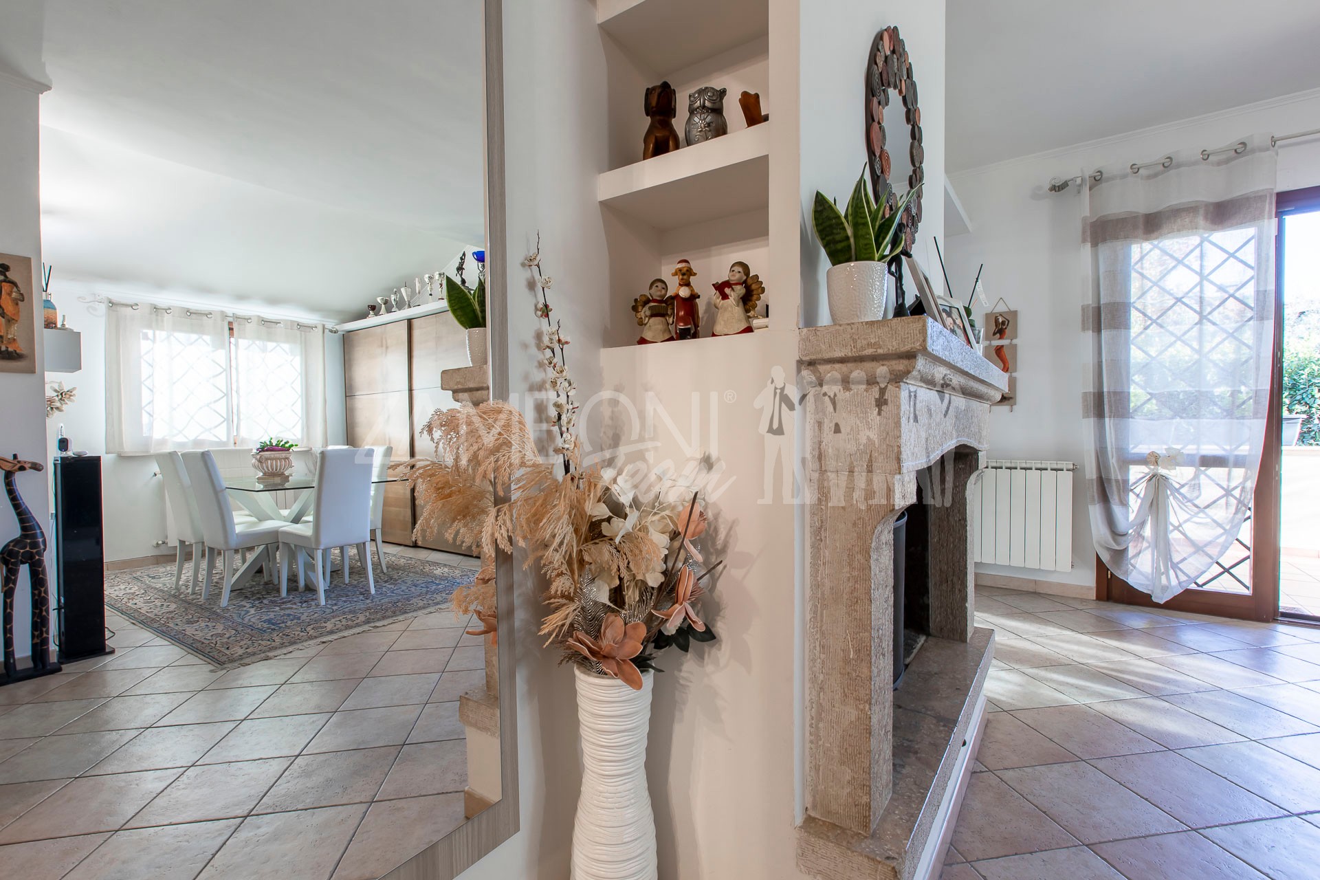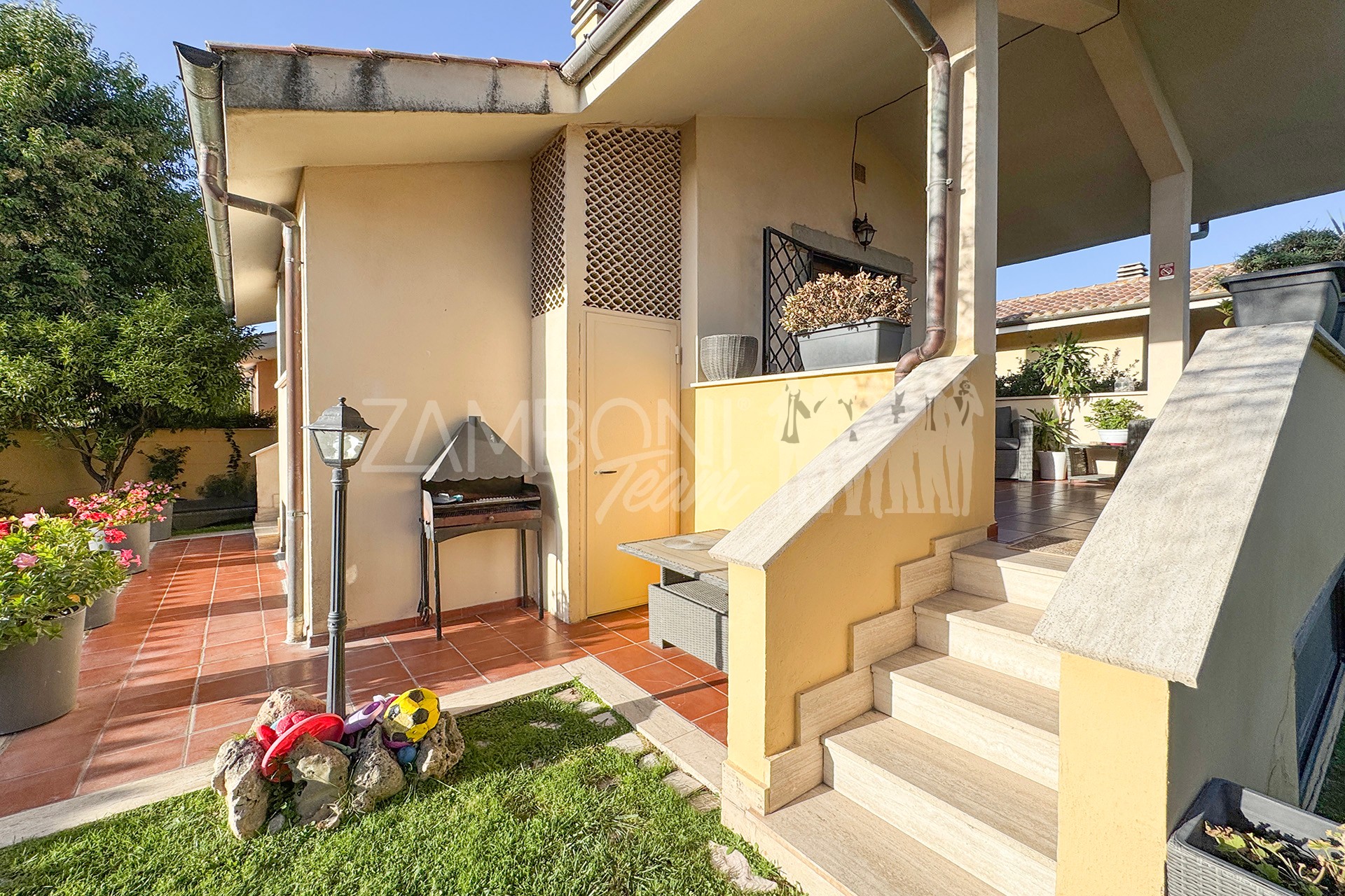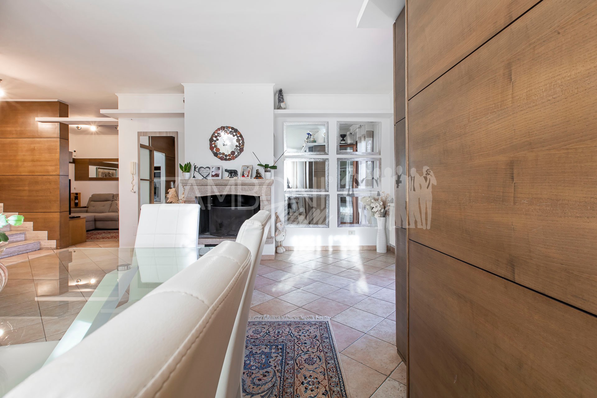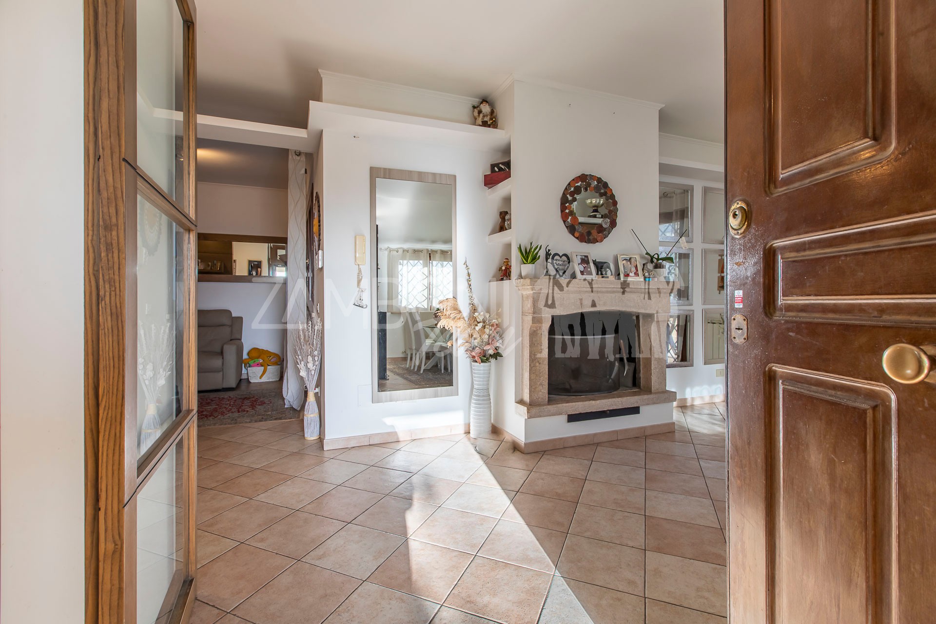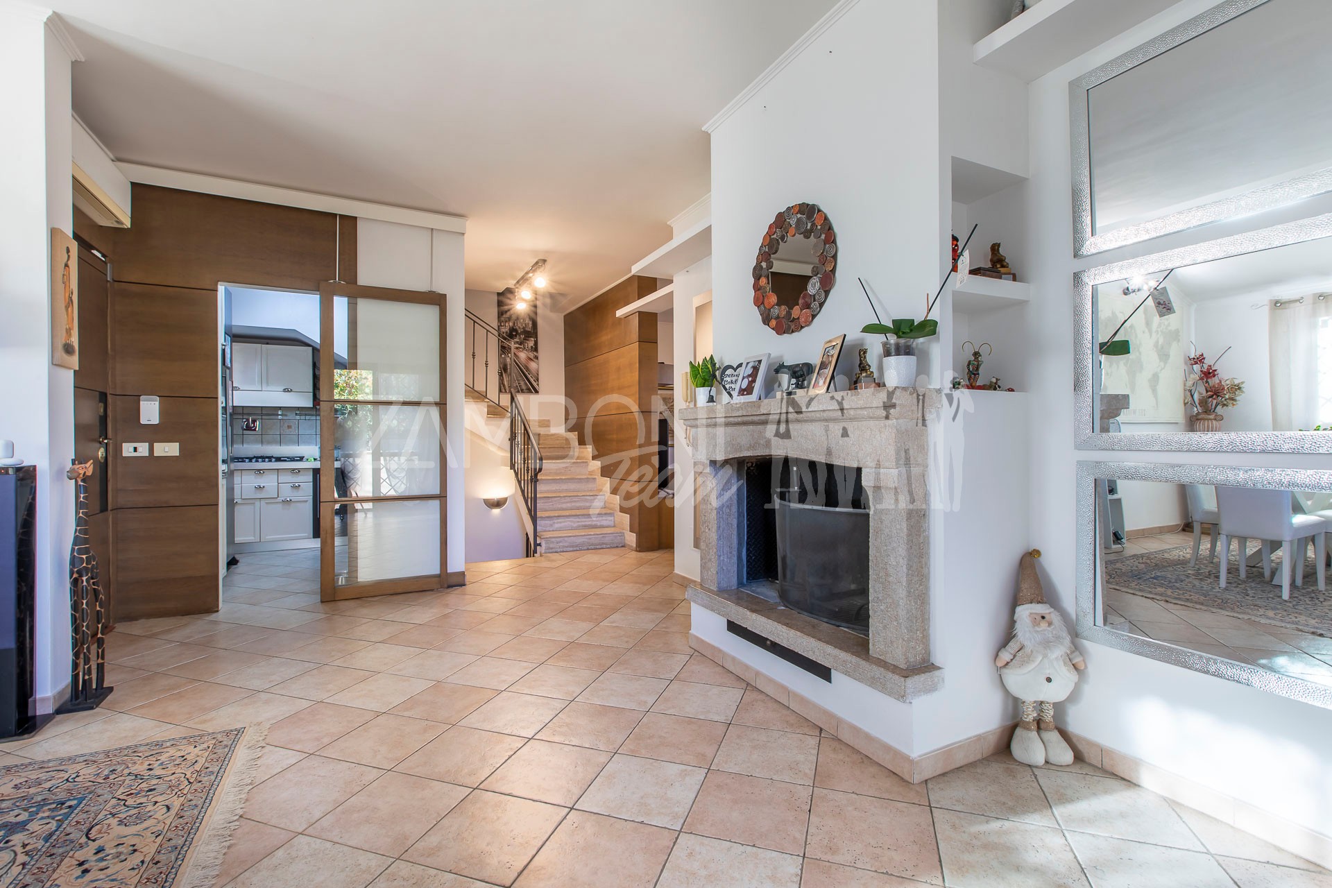 L’abitazione è ottimamente distribuita: dall’ingresso principale si accede al piano terra rialzato, dove troviamo un accogliente soggiorno con camino e una cucina separata da una porta a vetri scorrevole. Segue un ampio salone/zona relax e una veranda assolata con vista sul giardino.