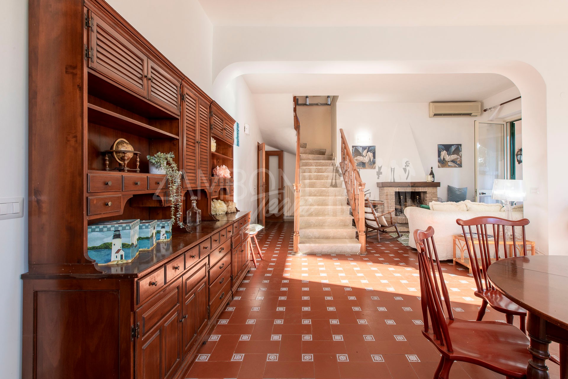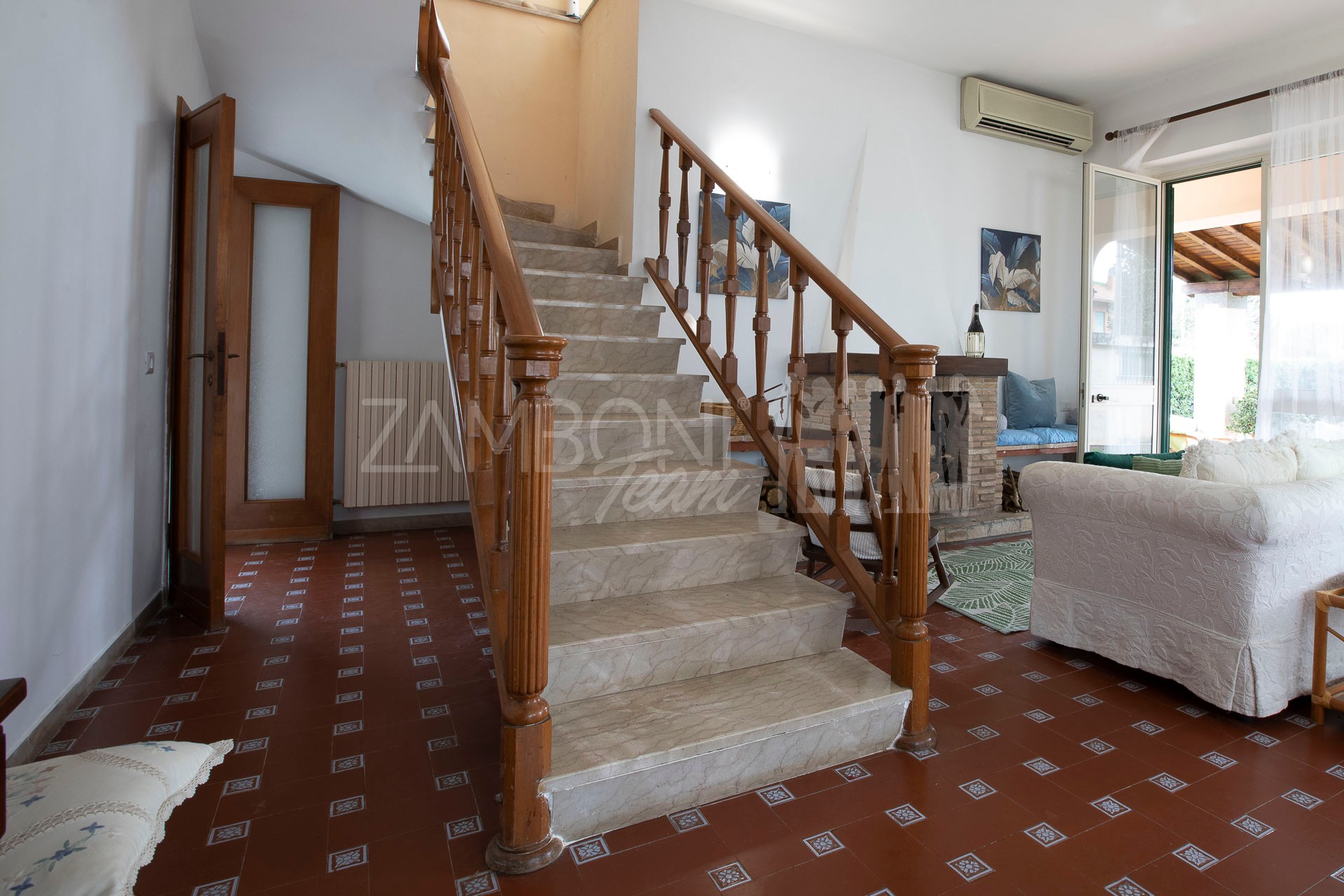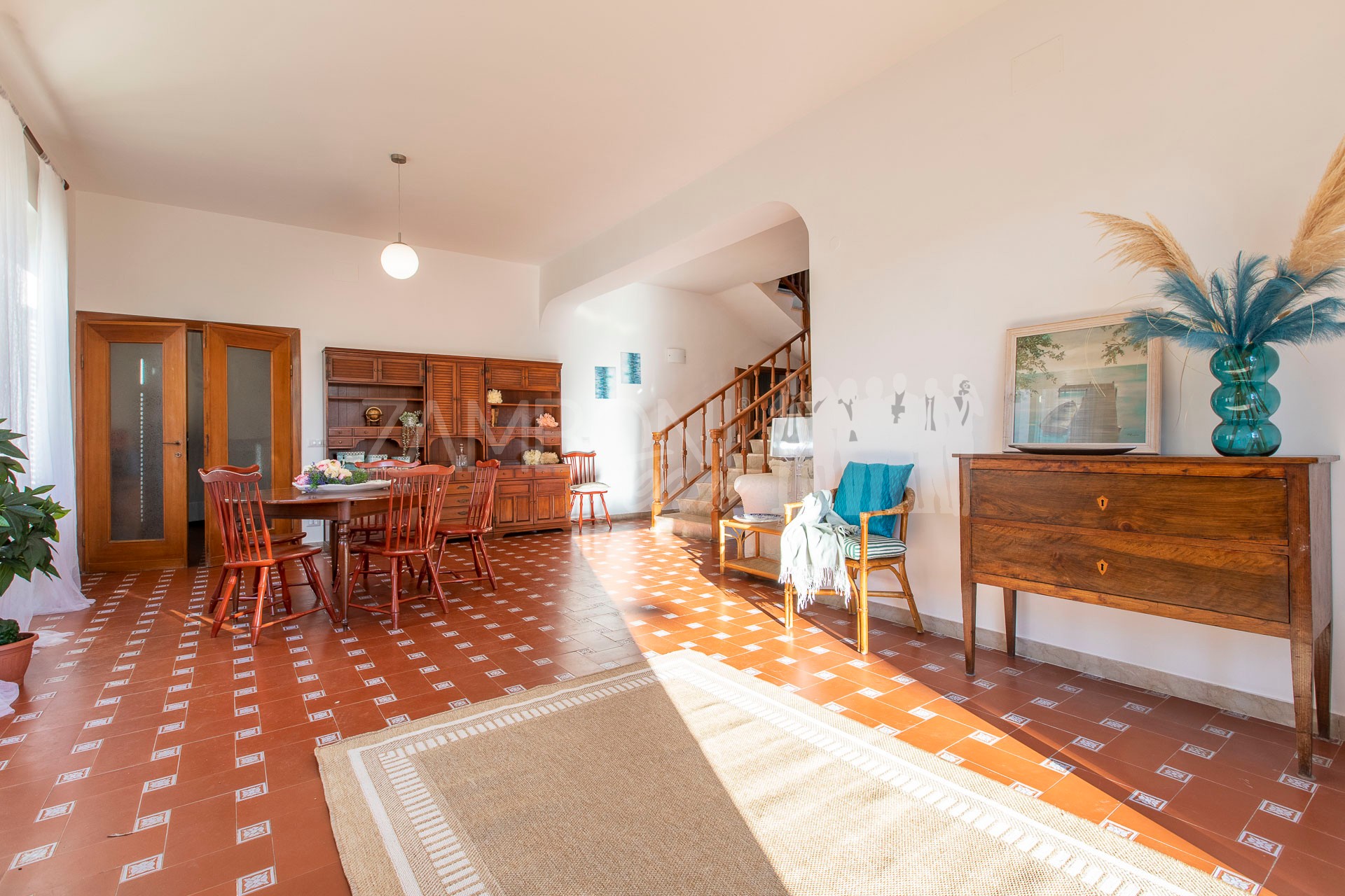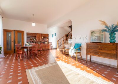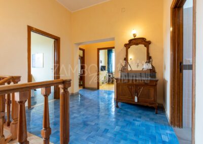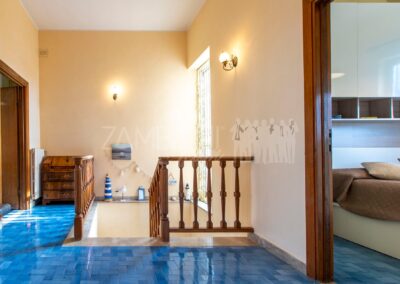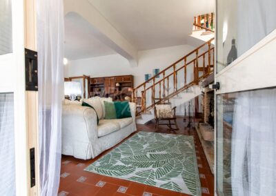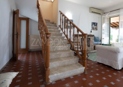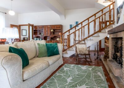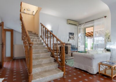 All’interno, l’ingresso conduce a un ampio salone di rappresentanza, inondato di luce grazie alle grandi porte finestre che creano una continuità armoniosa tra interno ed esterno. La scala diventa elemento distintivo del living e accompagna con stile al piano superiore.