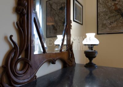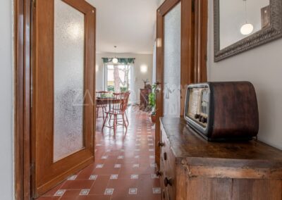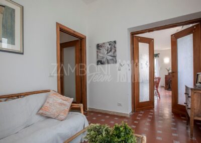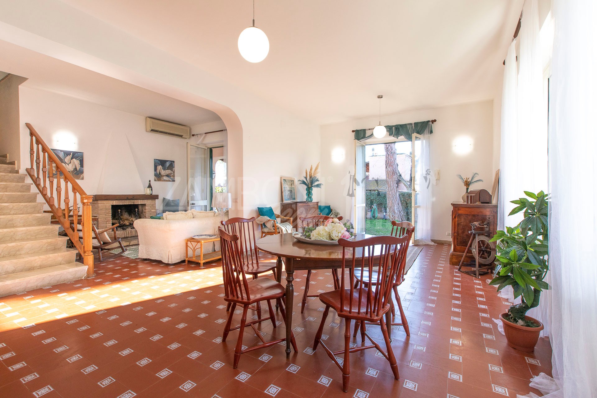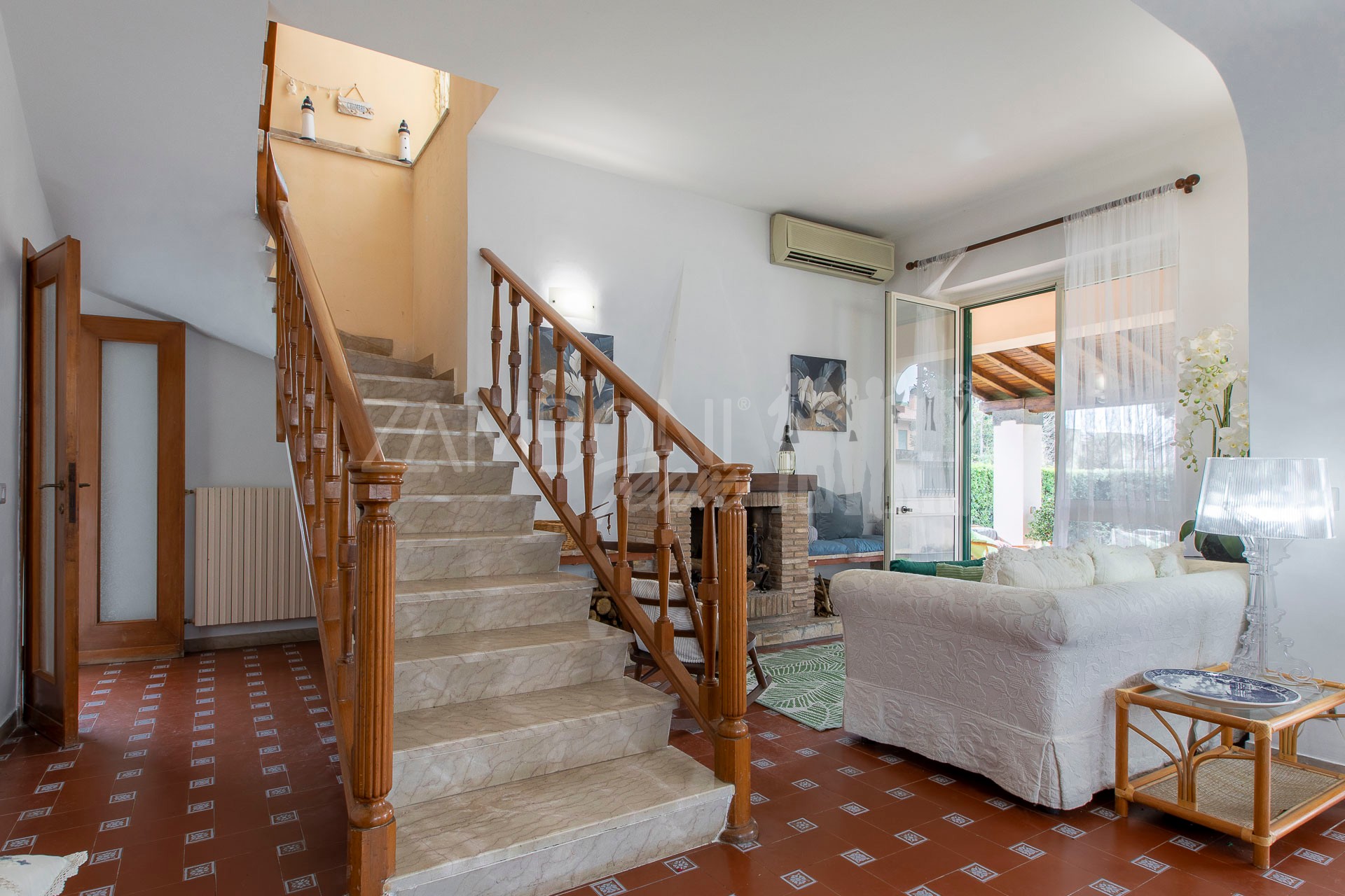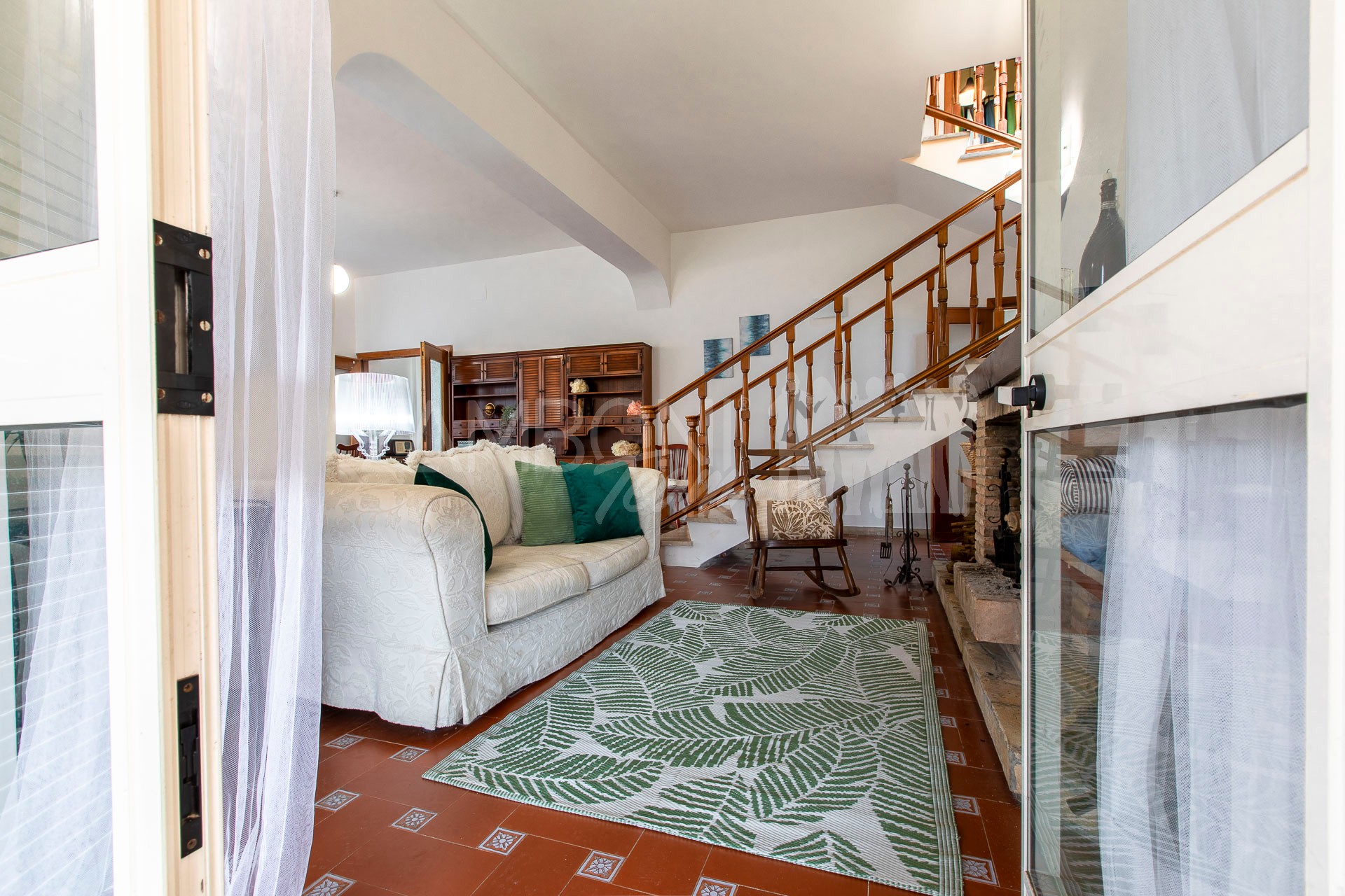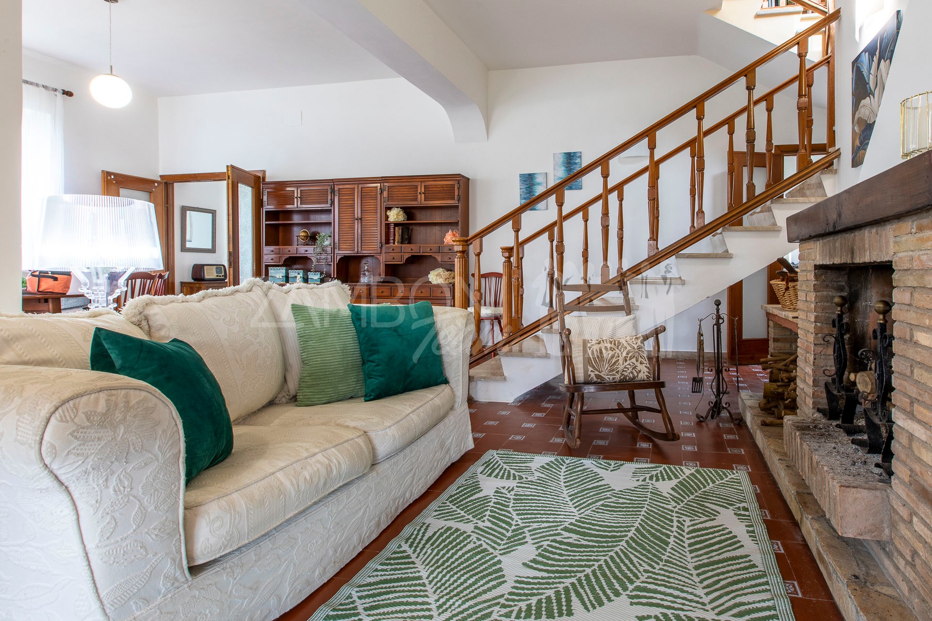 All’interno, l’ingresso conduce a un ampio salone di rappresentanza, inondato di luce grazie alle grandi porte finestre che creano una continuità armoniosa tra interno ed esterno. La scala diventa elemento distintivo del living e accompagna con stile al piano superiore.