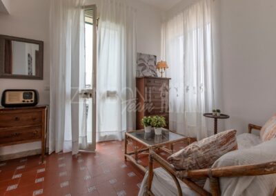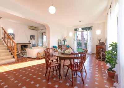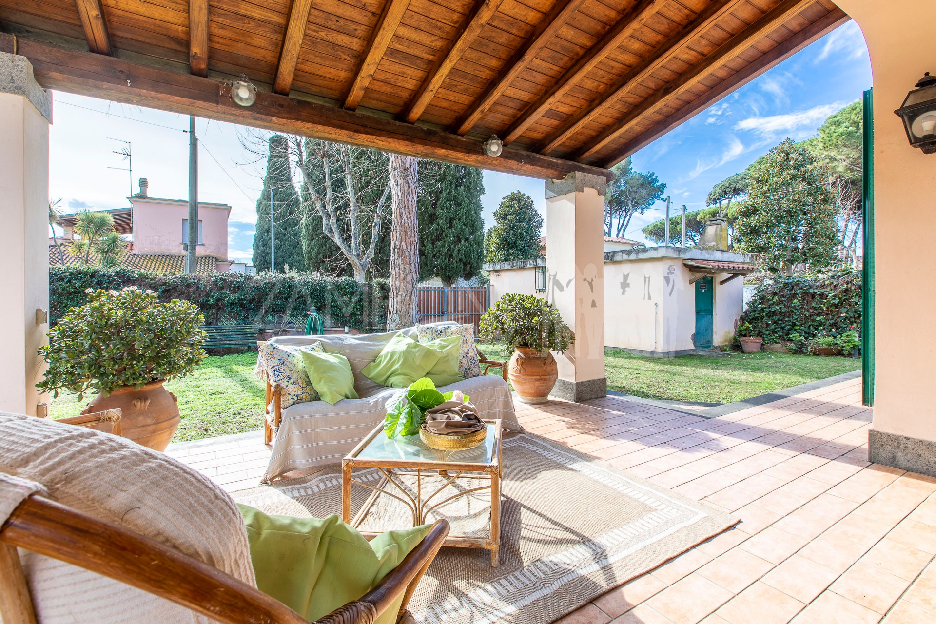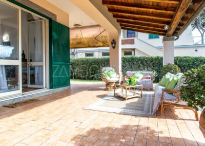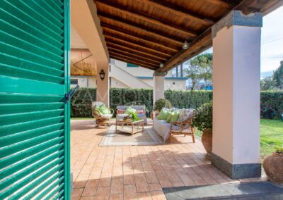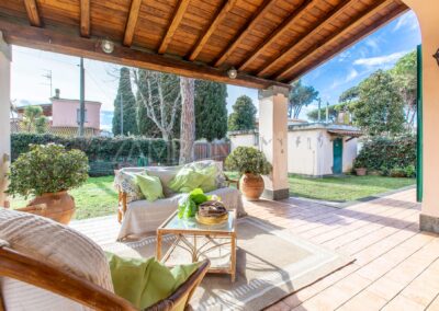 Il grande portico coperto, affacciato sul giardino, è il luogo ideale per cene estive, momenti conviviali e pomeriggi di relax, con il profumo del mare che accompagna ogni stagione.