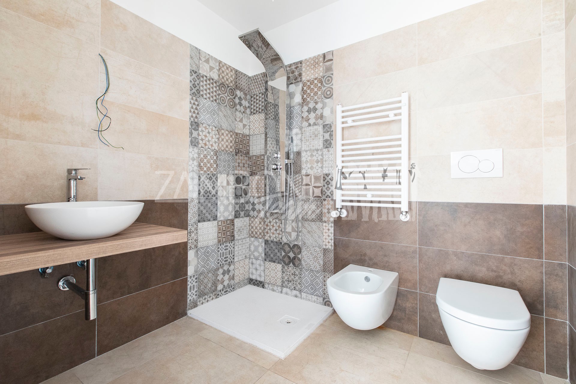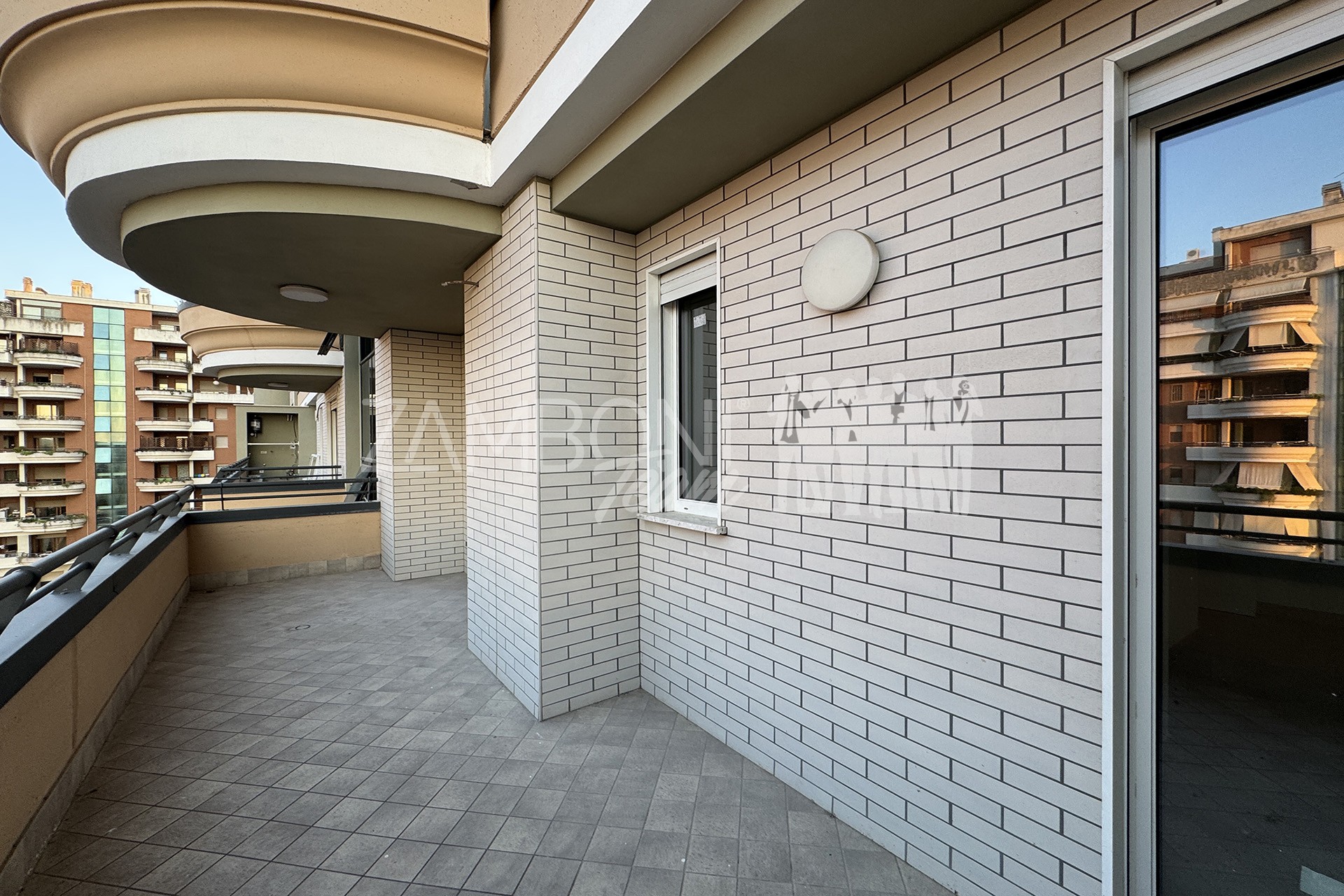 Una porta separa la zona giorno dalla zona notte, creando una netta distinzione tra gli ambienti. Qui troviamo due camere da letto matrimoniali, entrambe con accesso al secondo balcone, che si affaccia verso Roma, regalando uno sguardo aperto sulla città. La zona notte è completata da due bagni moderni e funzionali, entrambi completi e uno dei quali finestrato.