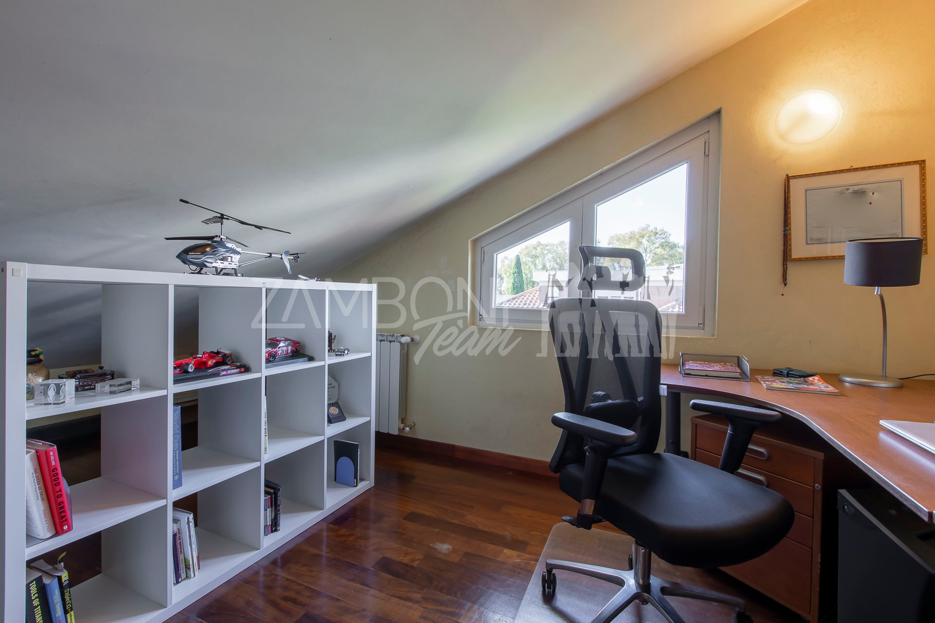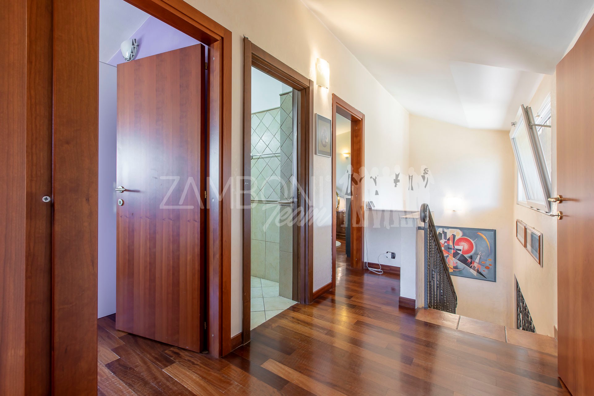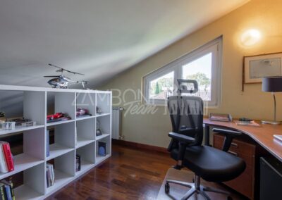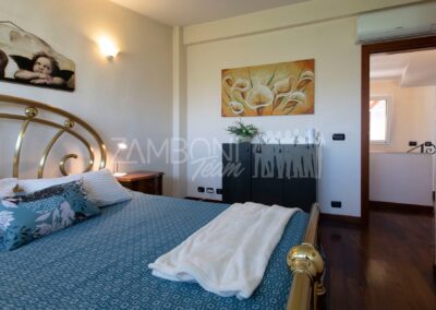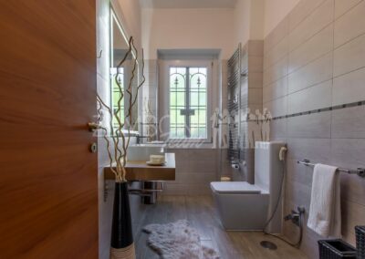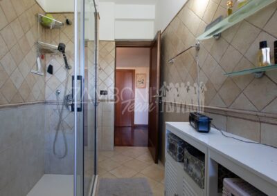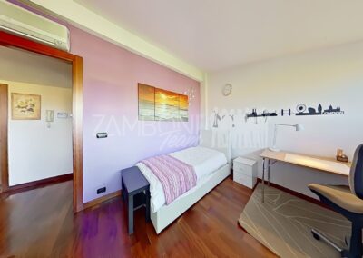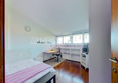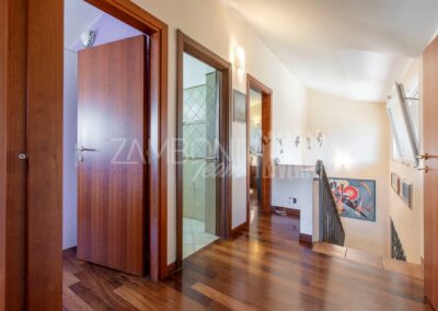 Al primo piano si sviluppa la zona notte con due camere matrimoniali, un ampio studio, un bagno con doccia e una zona lavanderia con terrazzo di servizio. Gli spazi sono ben distribuiti e ideali per garantire comfort e privacy a ogni membro della famiglia.