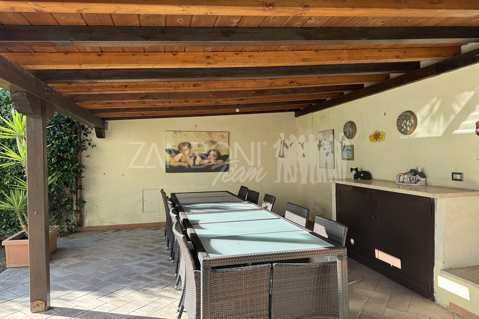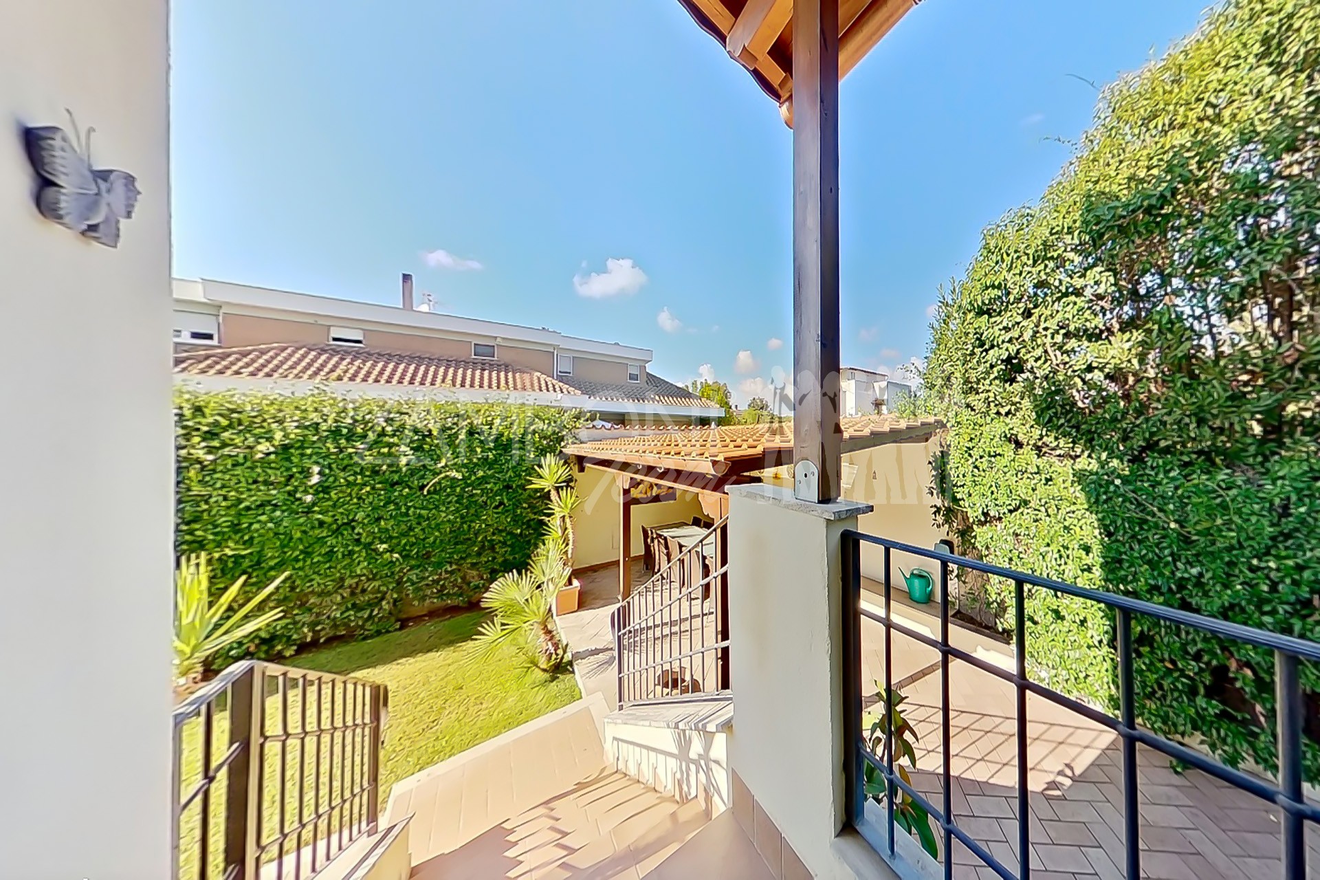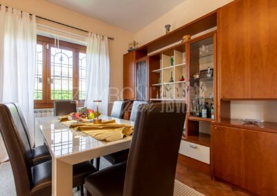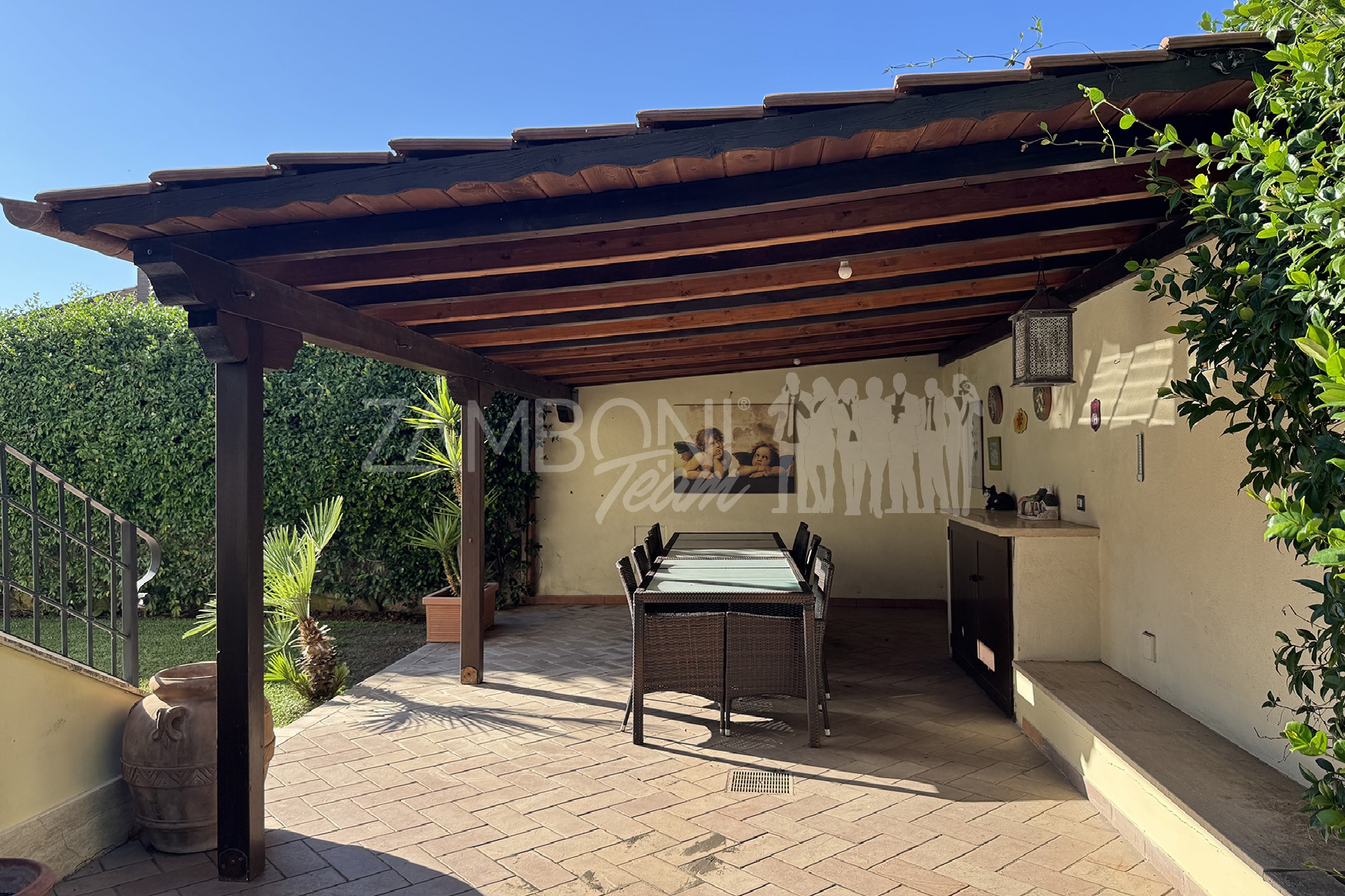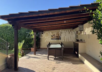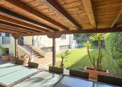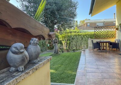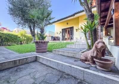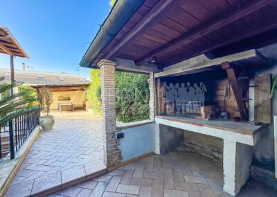 Allโesterno, un ampio e curato giardino privato circonda la villa, regalando unโatmosfera rilassante e riservata. La zona pavimentata fronte salone, lโarea barbecue con tettoia in legno e la zona pranzo coperta invitano a vivere appieno gli spazi esterni durante tutto lโanno. Completano la proprietร un ricovero per attrezzi e una copertura per auto.