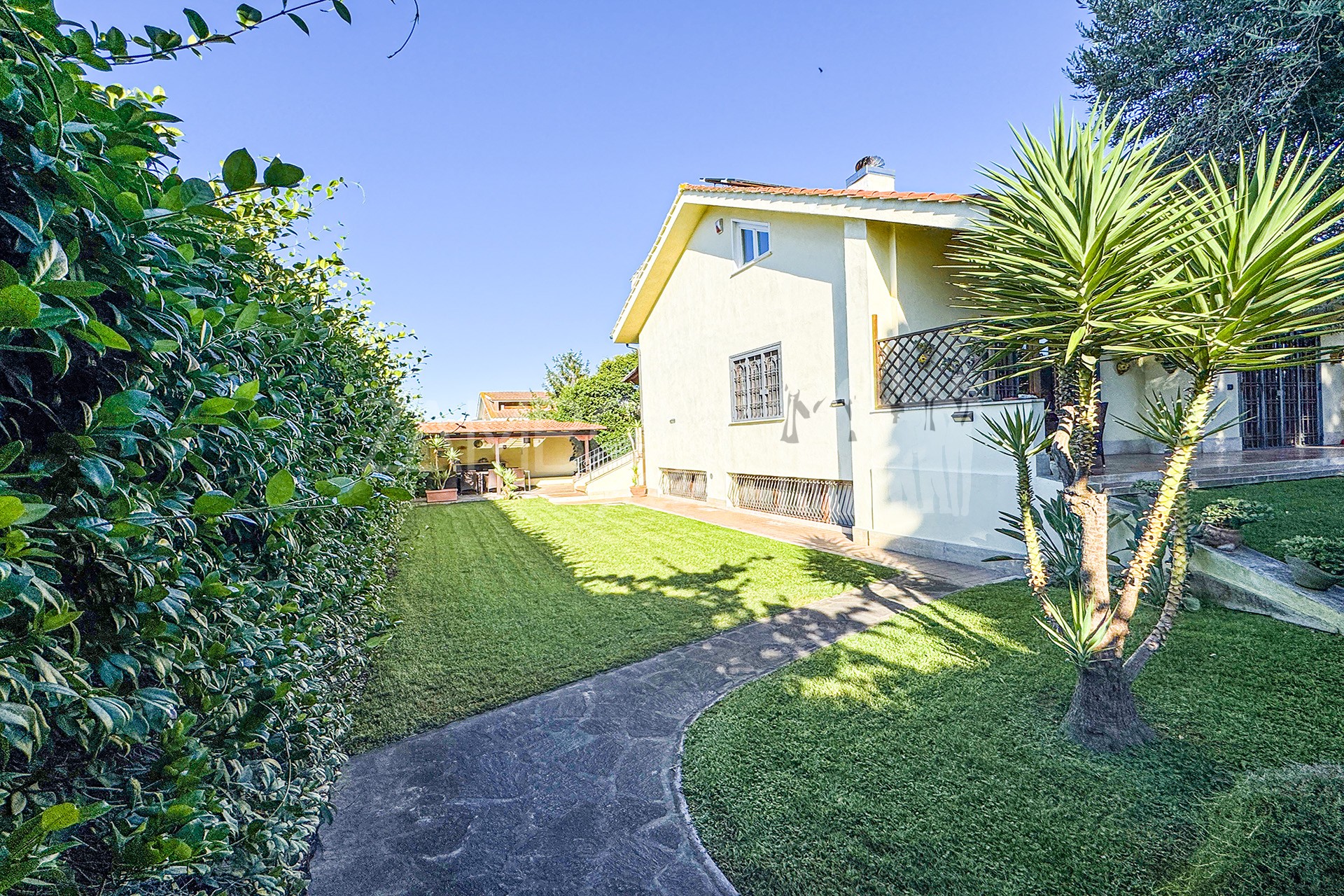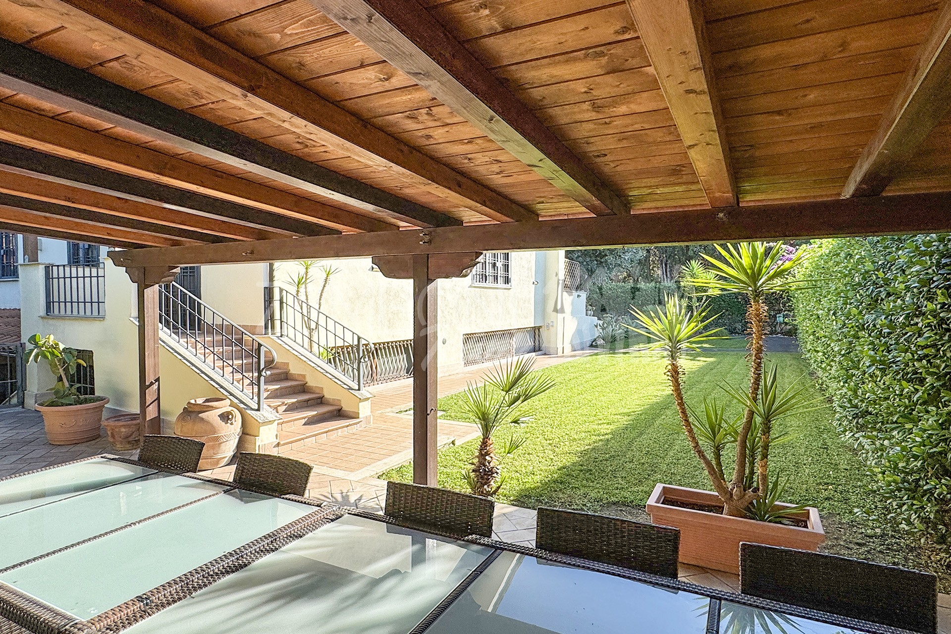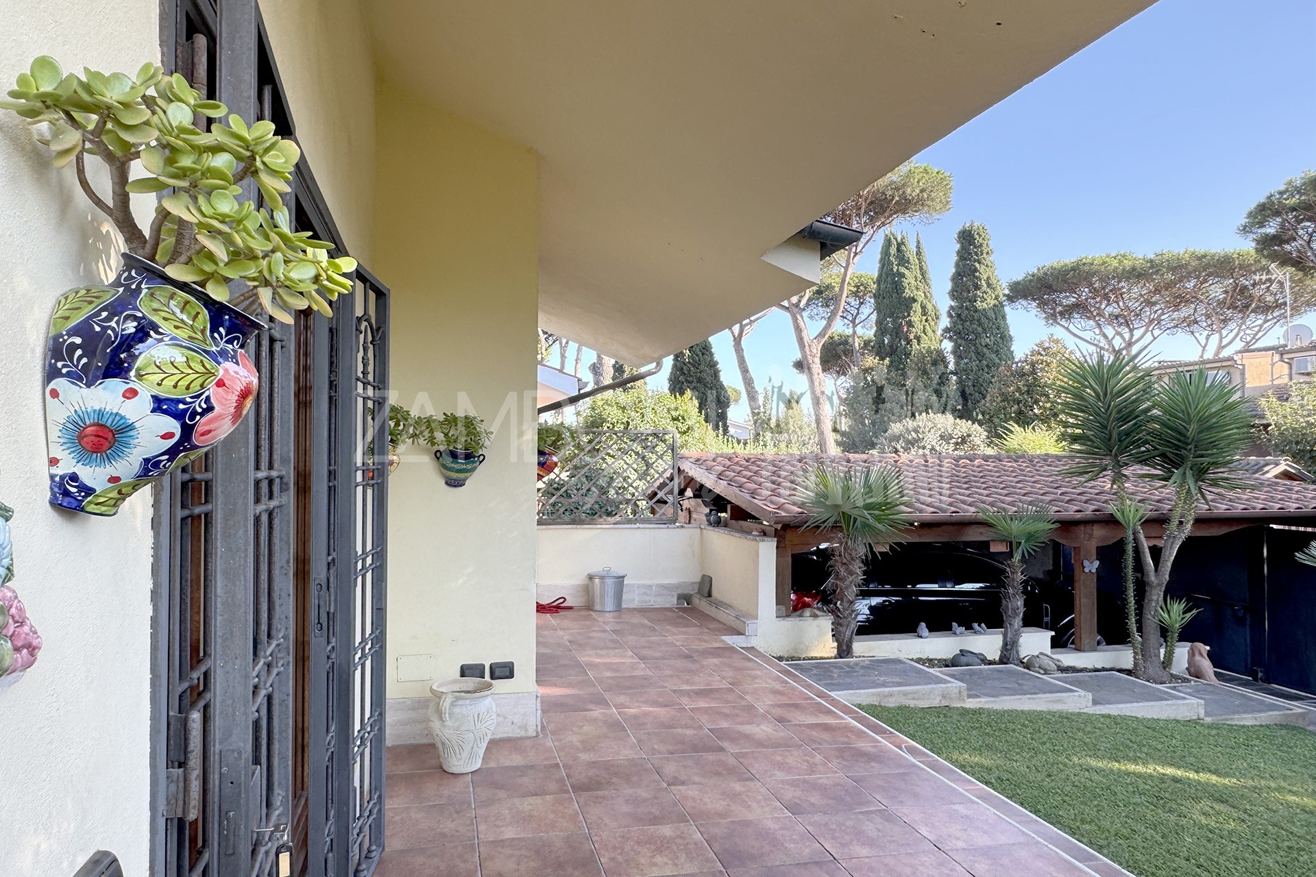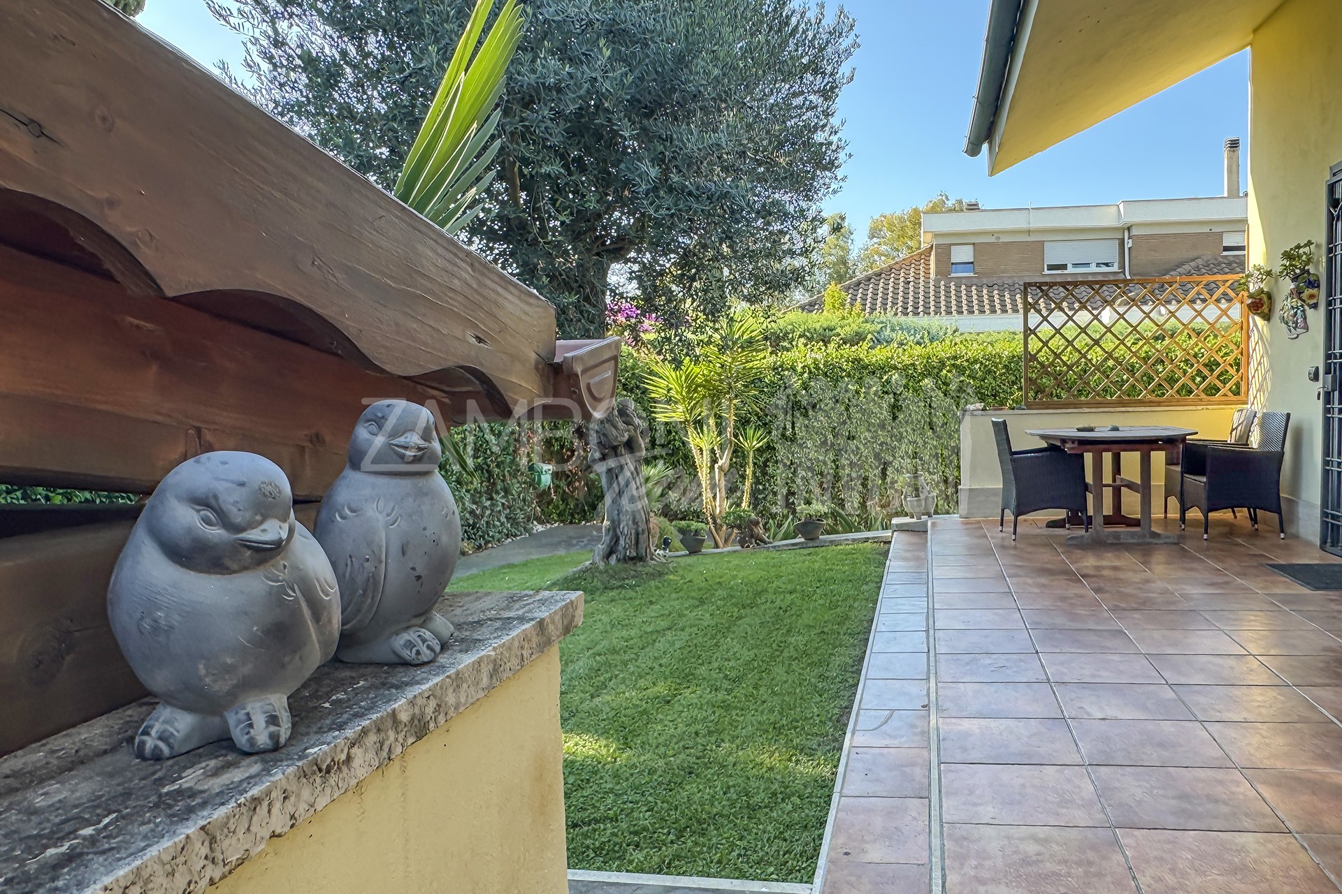 Allโesterno, un ampio e curato giardino privato circonda la villa, regalando unโatmosfera rilassante e riservata. La zona pavimentata fronte salone, lโarea barbecue con tettoia in legno e la zona pranzo coperta invitano a vivere appieno gli spazi esterni durante tutto lโanno. Completano la proprietร un ricovero per attrezzi e una copertura per auto.